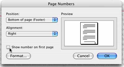 From the popup box that appears, choose the position (where you want the number to appear) and the alignment of the page number (right, left, center). Click off the option to "Show number on first page."