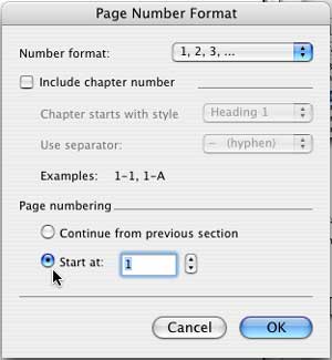 If you were to click "OK" at this point, the page numbering would start on your title page. You need to get the page numbering to start in the section where your cursor is, which contains the body of your essay. Click on the button that says "Format..." Then click on the button that says "Start at:" and key in "1." Now click "OK."