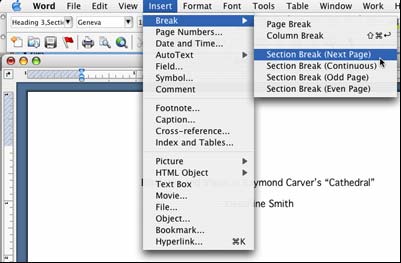 The first step is to create your sections. In Microsoft Word, put your cursor somewhere in your title page (click on the text somewhere on this page). From the "Insert" pulldown menu choose "Break" and "Section Break (Next Page)."